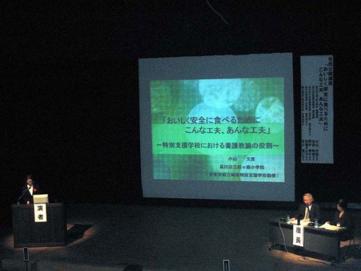 はじめに、養護教諭の小山文良先生から特別支援学校における給食への配慮について、個々の摂食能力や保護者、介助者および教員が抱える摂食介助への不安を把握し、安全・食環境を整えること・口腔衛生指導を軸に、誰もが無理をせずに肢体不自由児が安心・安全に学校給食を楽しめるように、保護者や担任教諭、学校歯科医、専門医療機関が連携することが大切であると述べられました。