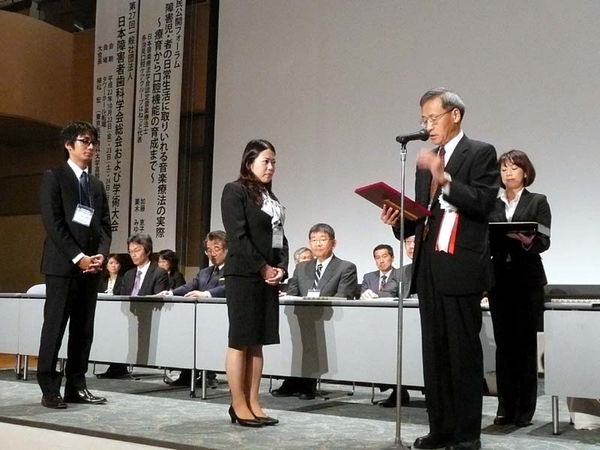 そして、向井認定委員会委員長より平成21年11月以降の認定医および認定歯科衛生士、指導医、臨床経験施設の動静が報告され、以上の報告後、冨田かをり先生と高橋賢晃先生の2名に日本障害者歯科学会優秀論文賞の表彰と贈呈が、拝野俊之先生と青柳暁子先生にIADH研究奨励賞の表彰と贈呈が行われました。